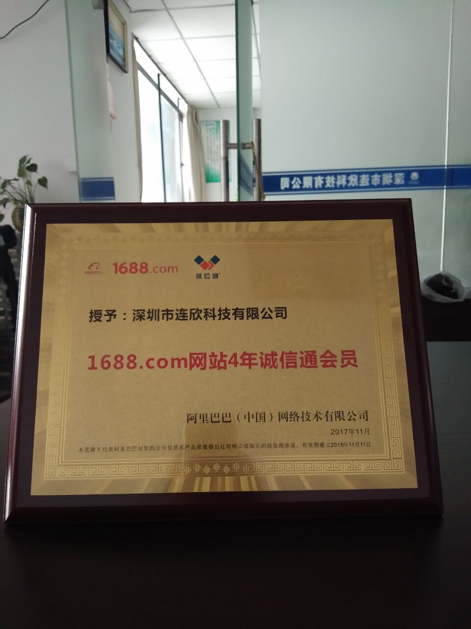 即2015年拿下阿里巴巴的“万企先锋会员证书”,2016-2017年先后拿下阿里巴巴授于的“百行诚信商家证书”,在连欣科技同仁的不懈努力下,于2017年的11月份再次拿到阿里巴巴的4年诚信会员证,这代表我们连欣科技对于每一位合作伙伴都是诚信为基准,互惠为原则的经营理念得到了广大客户和阿里巴巴的认可。