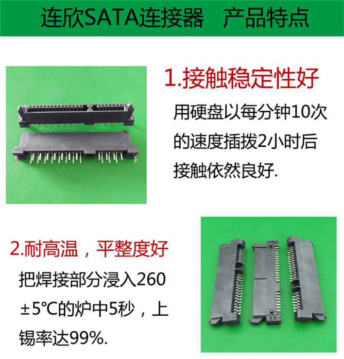 - 产品描述:《实力厂家》深圳市连欣科技有限公司是一家集研发、生产、销售于一体的一线连接器公司,公司的主要产品有:SATA连接器,SATA接口,SATA座子,SATA7PIN连接器,SATA连接器公母座,SATA硬盘接插件,SATA连接器90度插板,SATA连接器7+15PIN,欢迎来电详询:王小姐18688784599 QQ:2099385828 选择连欣连接器,选择放心合作伙伴!