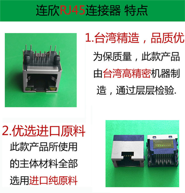 - 产品描述:《实力厂家》深圳市连欣科技有限公司是一家集研发、生产、销售于一体的一线连接器公司,公司的主要产品有:RJ45连接器,RJ45网络接口,J45连接器插座,RJ45 90度插板式18.4MM 连接器,RJ45连接器, RJ45网络接口座子, RJ45插头,RJ45网络插头90度插板式,欢迎来电详询:王小姐18688784599 QQ:2099385828 选择连欣连接器,选择放心合作伙伴!