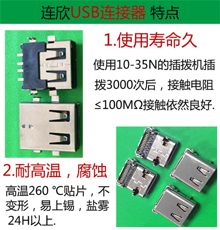 沙井连接器 USB 2.0A母直插板 15.0MM长 卷边直角 数码专用