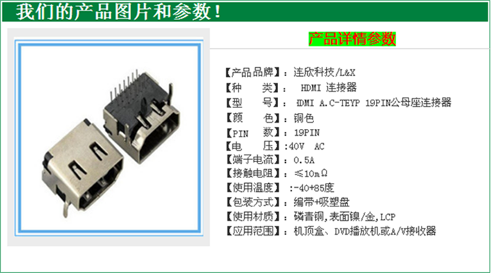 - 产品描述:深圳市连欣科技有限公司专业生产销售-深圳HDMI接口,沙井HDMI连接器厂家,HDMI A型母座,HDMI插板式19PIN,HDMI A TYPE,高清接口座子,HDMI连接器插座 HDMI A TYPE母座插板式,欢迎来电详询:王小姐18688784599 QQ:2099385828 连择连欣连接器,连择放心合作伙伴!