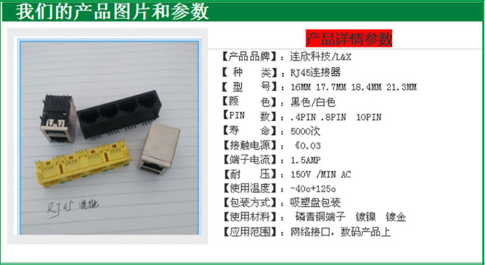 - 产品描述:深圳市连欣科技有限公司专业生产销售-RJ45 连接器 RJ45网络接口座子 网络插头1*4排插全塑款RJ45 ,欢迎来电详询:王小姐18688784599 QQ:2099385828 选择连欣连接器,连择放心合作伙伴!