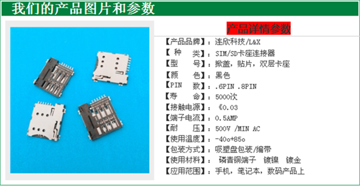 - 产品描述:深圳市连欣科技有限公司 www.szlianxinkeji.com是一家专业研发生产SIM卡座的优质供应商,公司SIM卡座品质稳定,价格优惠,交期快,并可以为你提供一站式的SIM卡座的解决方案和技术支持;欢迎来电详询:王小姐18688784599 QQ:2099385828 选择连欣连接器,选择放心合作伙伴
